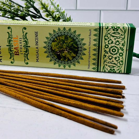 Ayurveda Incense is a high quality authentic Indian Incense that is a concentrate of essential oils of cedar, fir, pine, and aloe vera which is believed to help promote purity and calm living environments. A sweet and earthy aroma, with our selection of white sage, basil and palo santo.