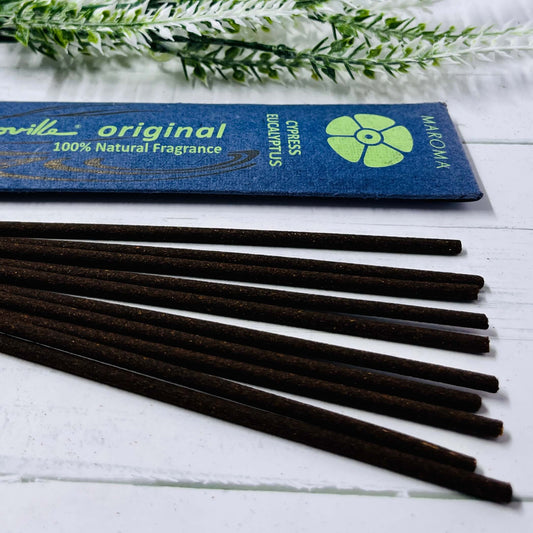 Maroma Incense are hand rolled with wood powder and gum resin, without charcoal additive. The finished sticks are then dipped into proprietary fragrances, which have been blended with pure essential oils.