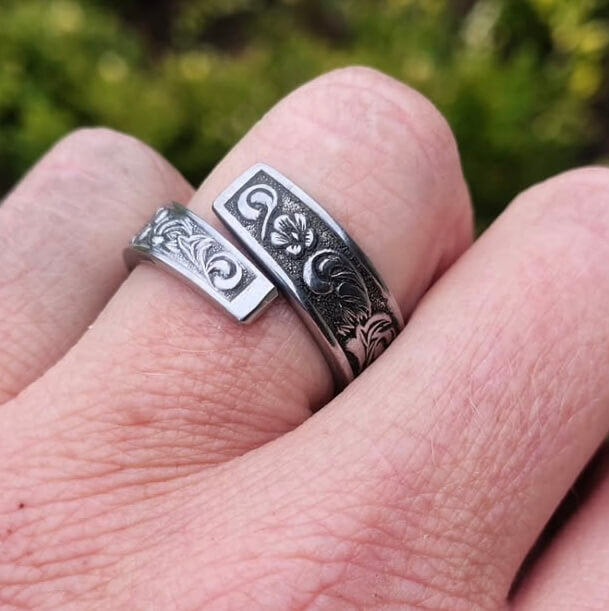 Crafted by hand from recycled stainless steel cutlery sourced across 300+ antique stores, the Cutlery Cover Floral Ring blends timeless charm with eco-conscious style. Each unique piece showcases delicate floral details, making it a statement accessory that honors history and sustainability. Durable yet elegant, this ring is perfect for those who value craftsmanship and wish to wear a story on their finger.
