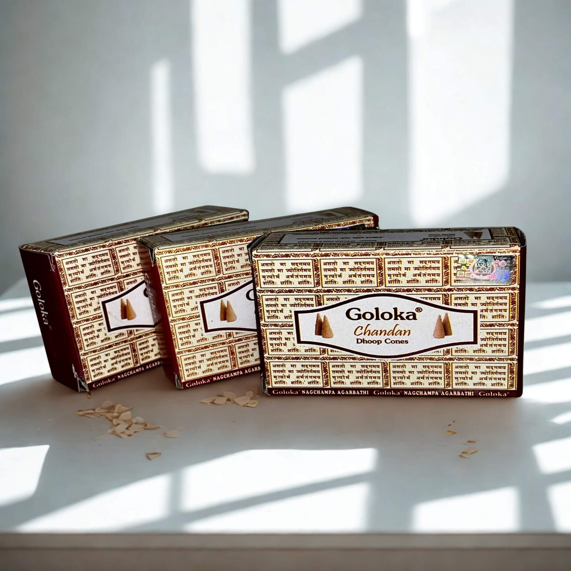 Goloka - Chandan (Sandalwood) is a cooling fragrance that creates a peaceful and spiritual atmosphere. Thes beautiful cones come with a little ceramic disc stand. 10 cones per pkt.
